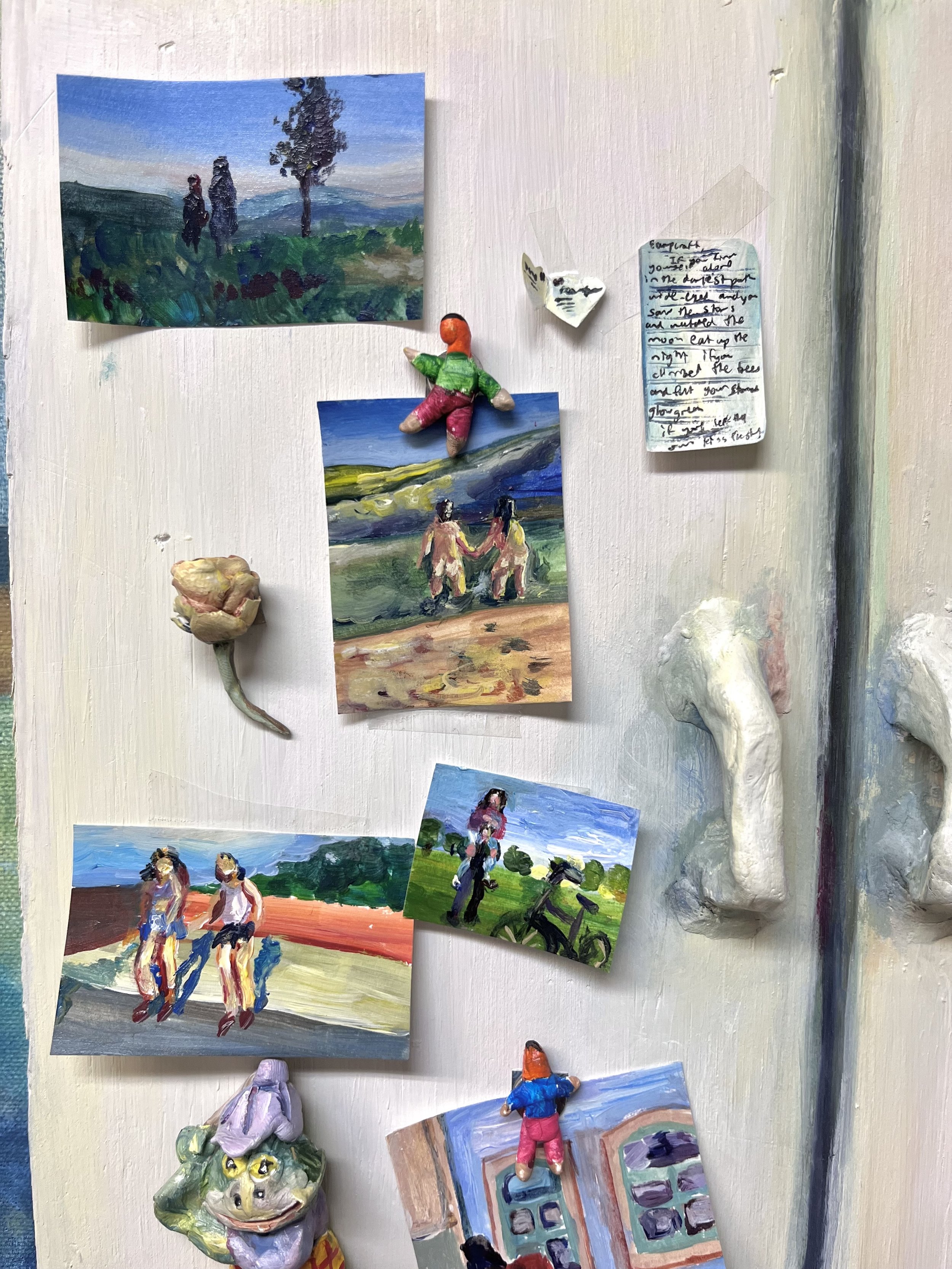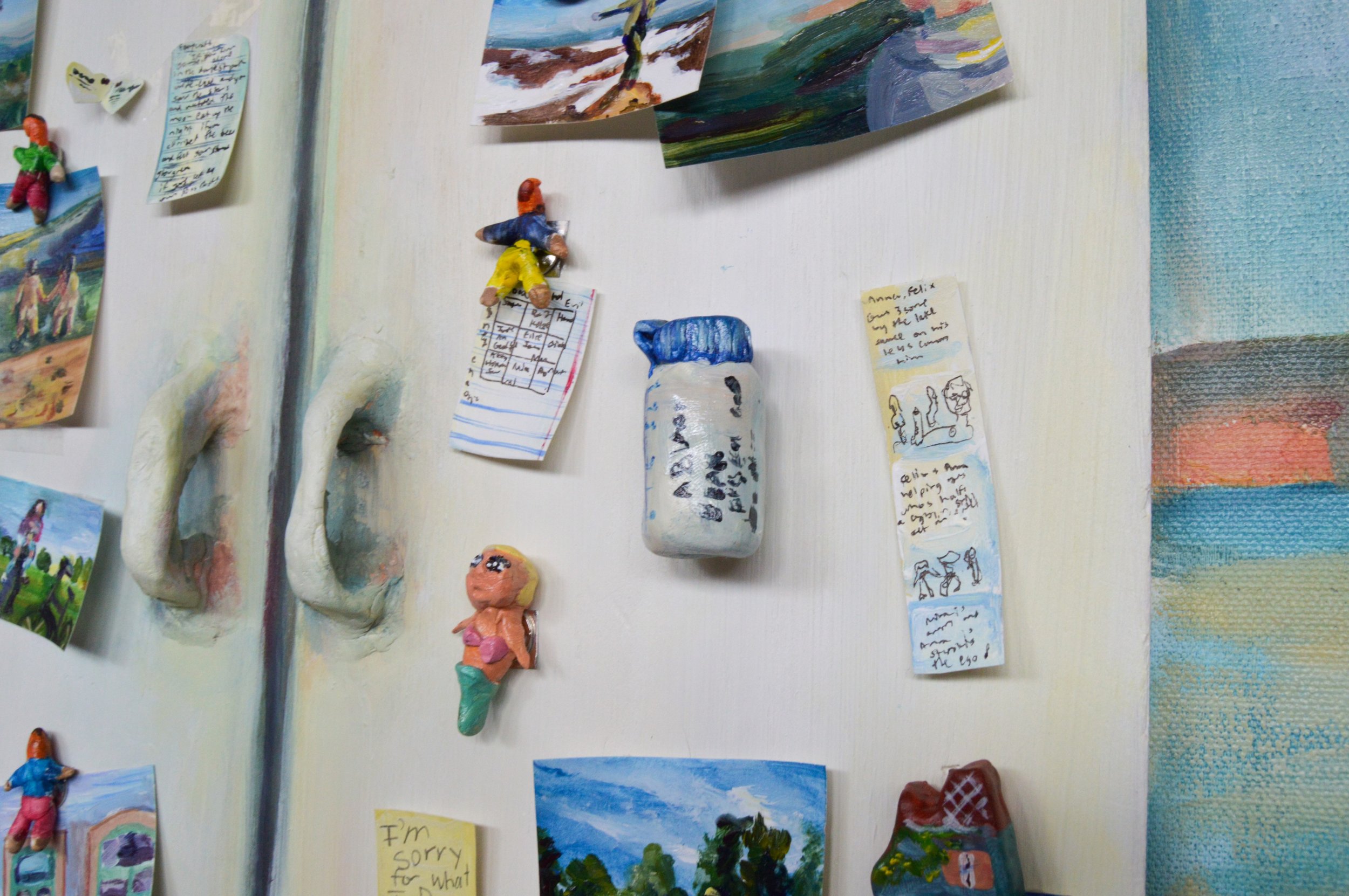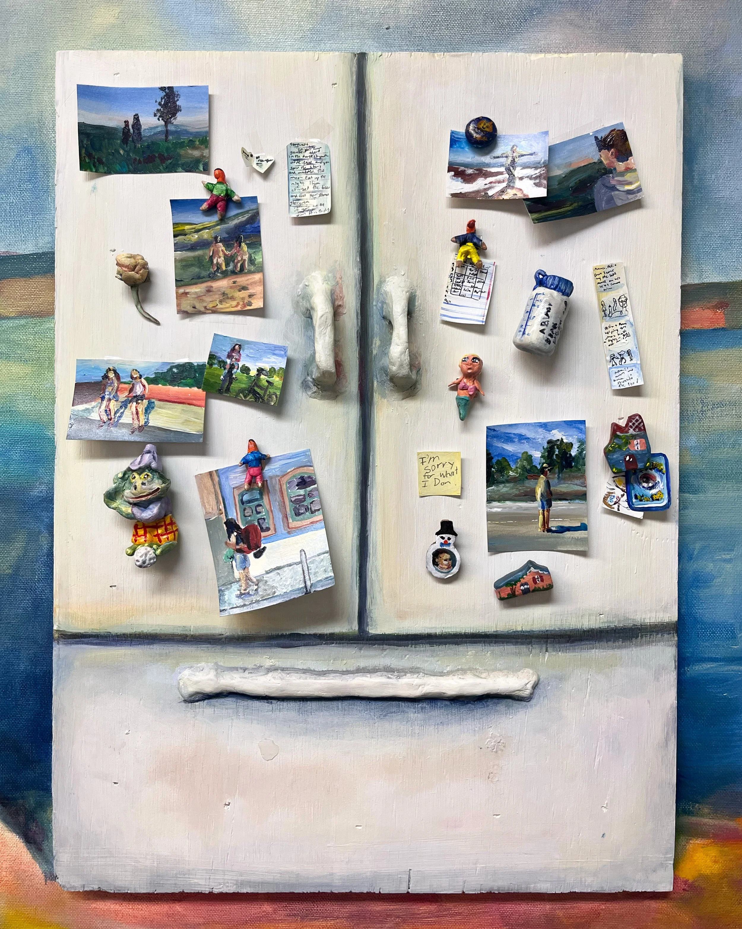 “Homecoming”, 72" x 60" x 2", Oil, wood, acrylic, sculpey polymer clay, modelling clay, paper, cardboard, magnets, pencil, and pen ink on canvas