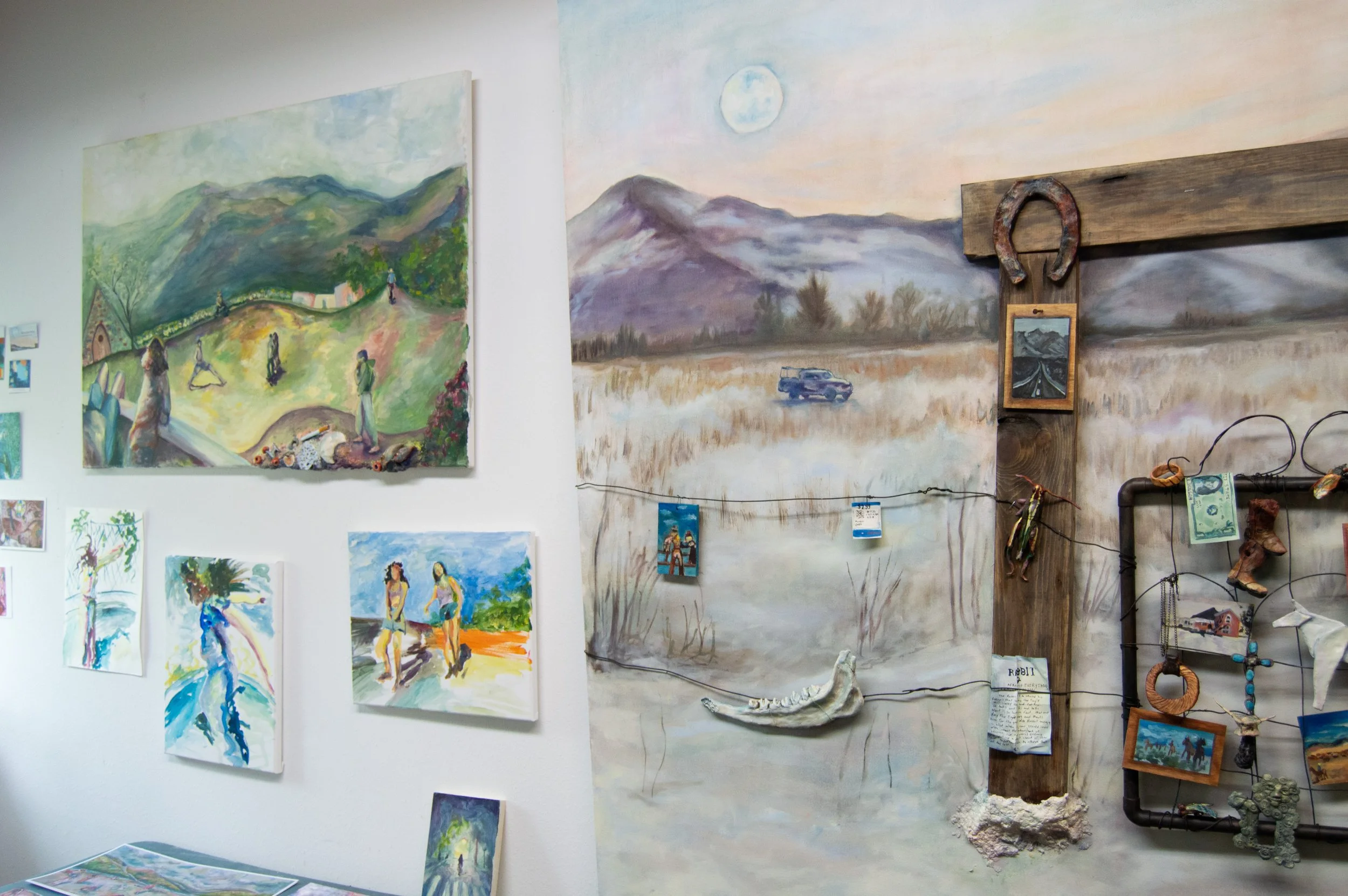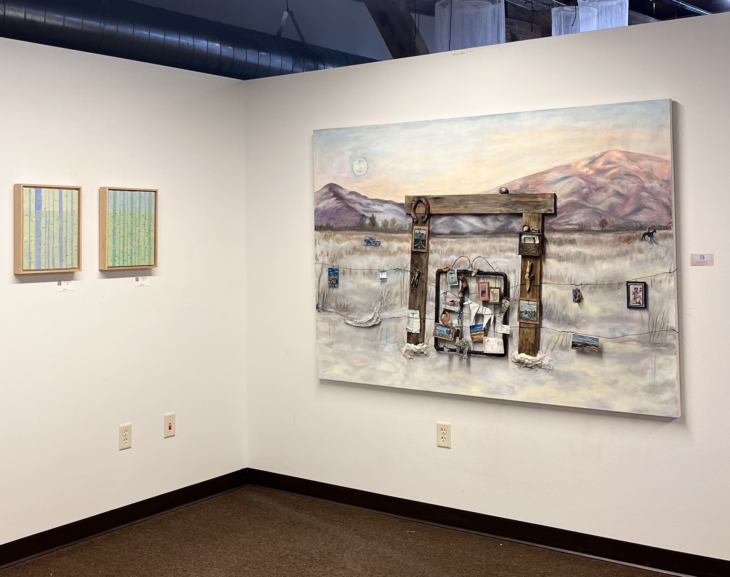 “Cowboy Christmas”, 52" x 72" x 3", Oil, acrylic, wood, wire, sculpey polymer clay, sculptamold compound (clay, plaster, paper-mache), paper, nails, and necklace chain on canvas