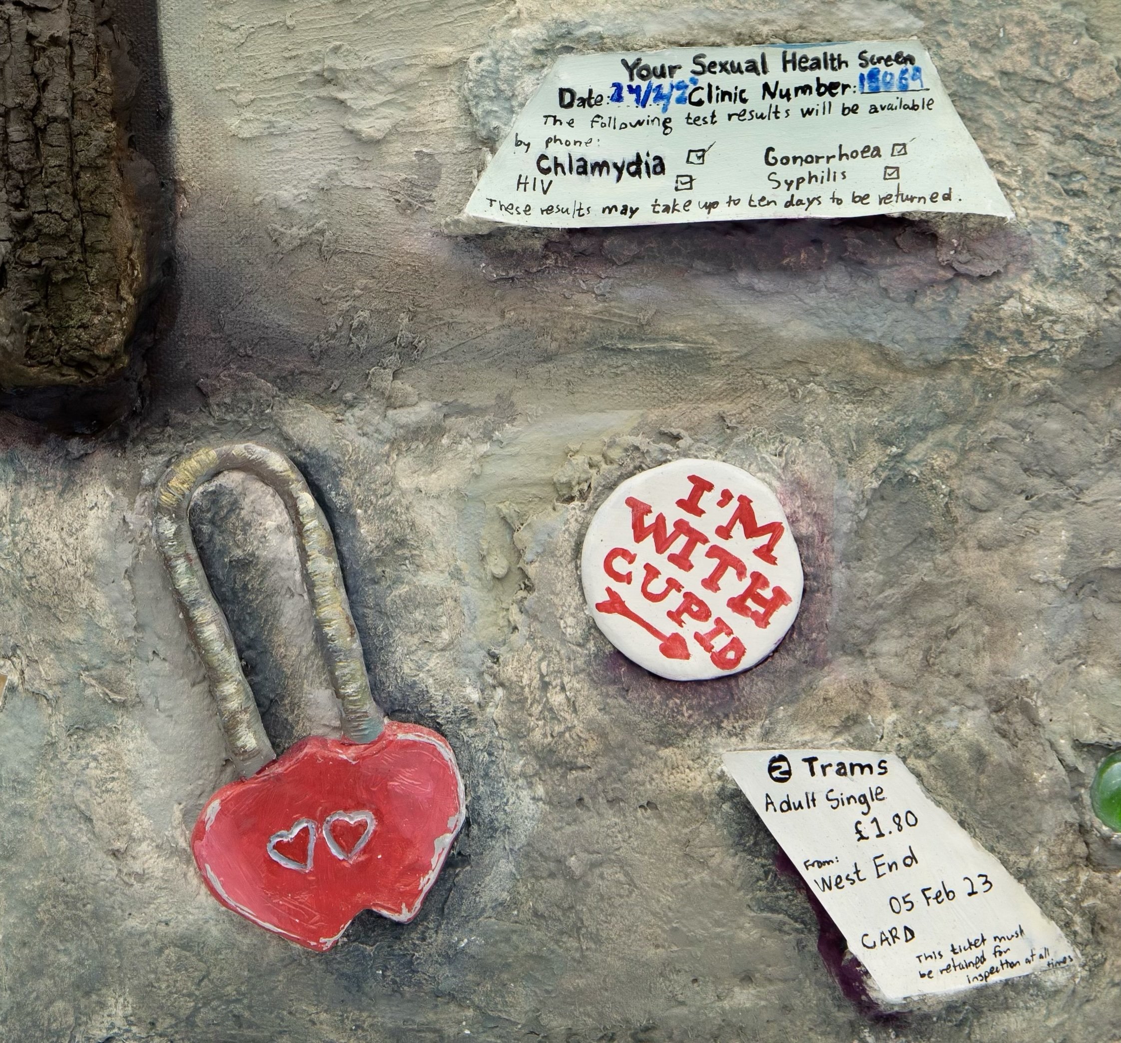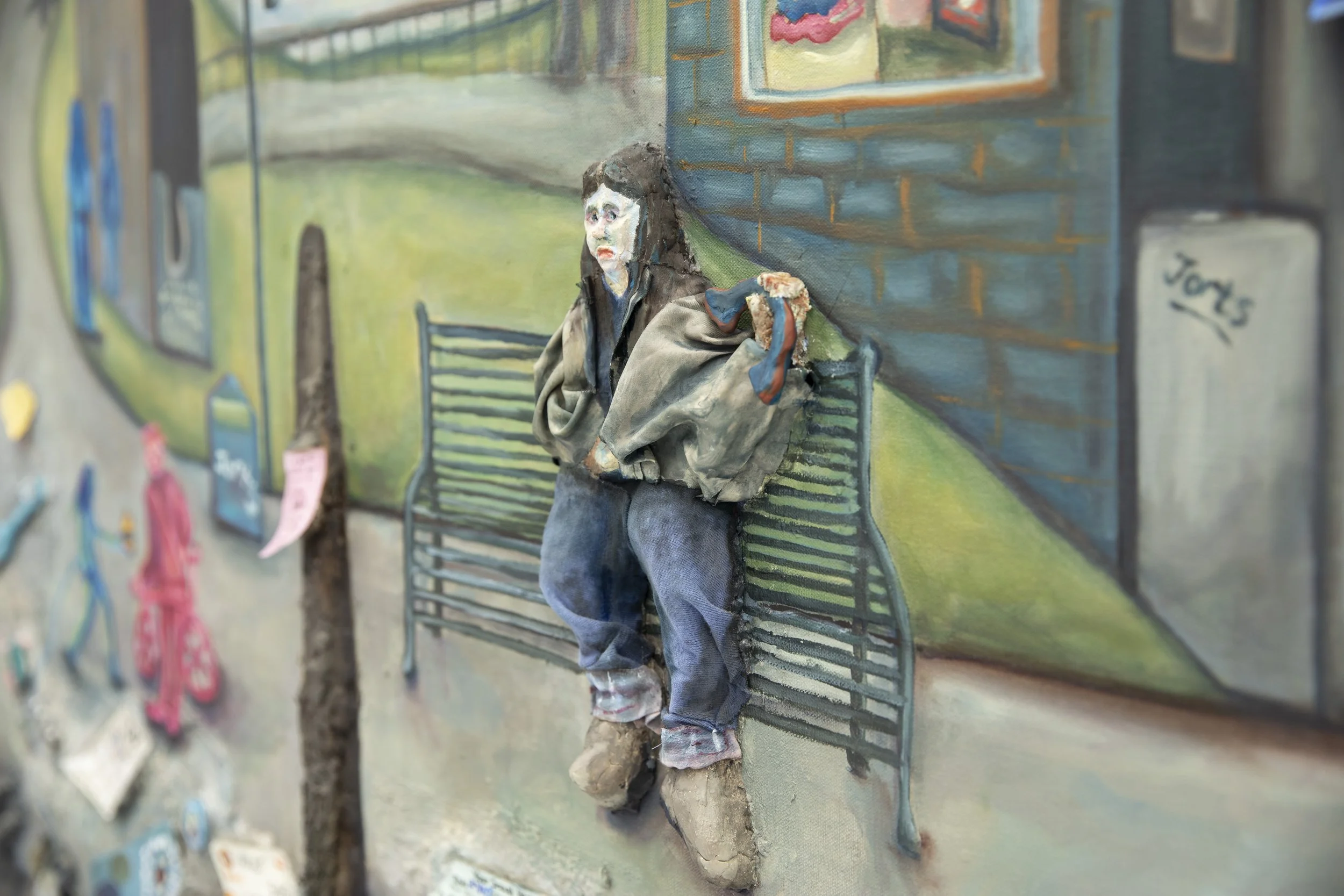 51" x 108" x 2.5", Oil, acrylic, charcoal, sculptamold compound, modelling clay, sculpey polymer clay, plaster, paper, cardboard, fabric from my old clothes, string, and tree bark on canvas